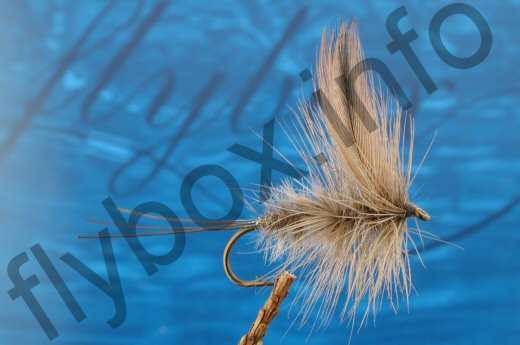 - Hackle : One dark dun genetic cock hackle and one blue jay body feather wound behind, through and in front of the wing.